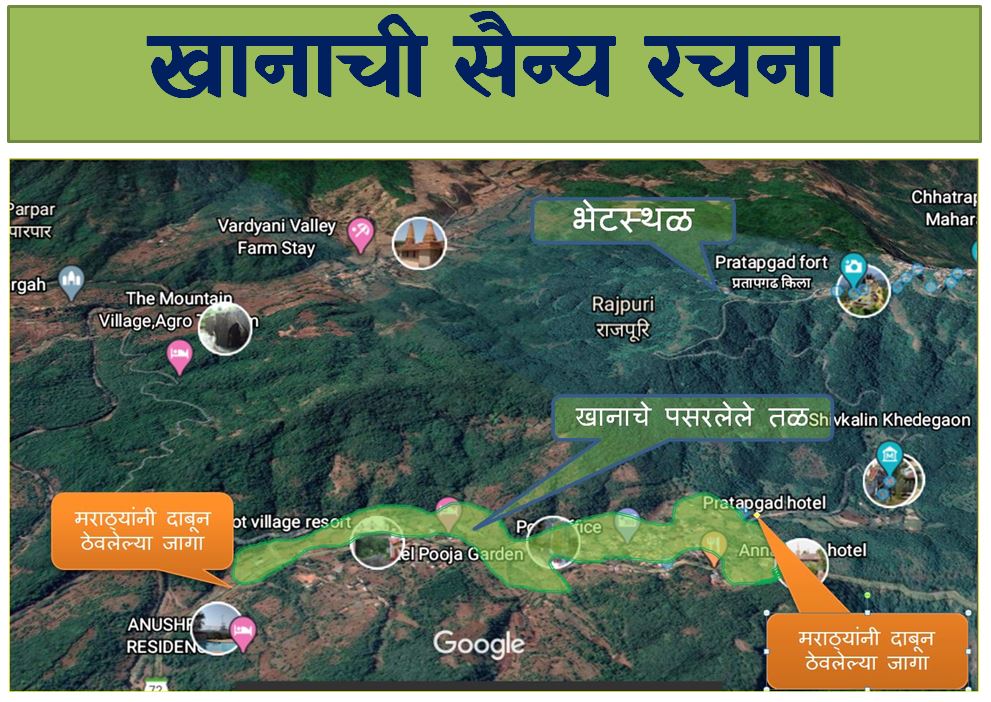 खानाचा शाही हत्ती डुलत यायला वेळ लागला, तोवर खानाच्या राहण्याची सोय जावळीच्या मोऱ्यांनी आपल्या महालात केली. भेटीची तारीख १० नोव्हेंबर ठरली होती. त्याआधी २ रात्री म्हणजे ७ तारखेला रात्री उशिरापर्यंत दिवट्यांच्या प्रकाशाच्या अनुरोधाने सैनिकांचे जथ्थे येत राहिले. खान जातीने लक्ष घालून कोण सरदार कुठे तळ ठोकून हवेत यावर आपले निर्णय देत होता. खानाने रात्रीची विश्रांती घेऊन आपल्या सरदारांशी पुढील हालचाालींसाठी चर्चेला ८ तारखेला सकाळी नमाज़ नंतर बोलावले. त्यात चार प्रमुख प्रस्ताव होते.
