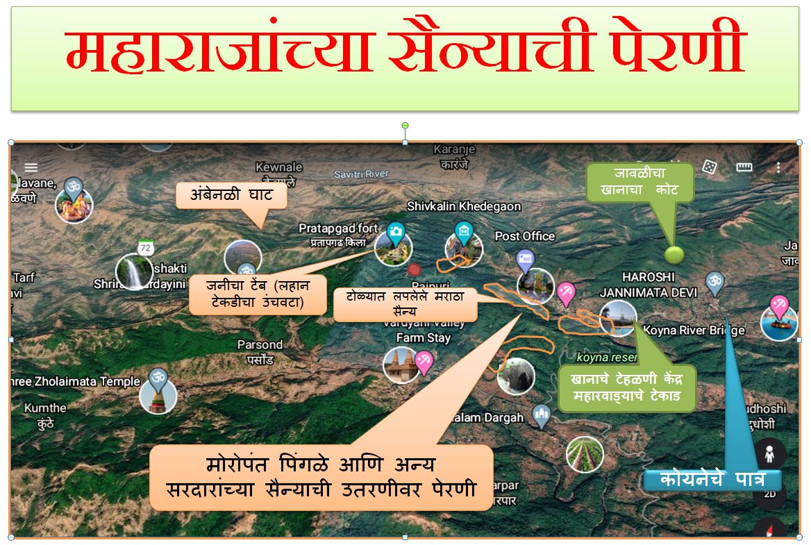 सरदारांच्या सेना सावकाश, सावधपणे खाली उतरून कोयनेच्या काठावरील वेळूच्या बनात आपापल्या टोळ्यांचे कोंडाळे करून तळ ठोकला. तिथून जवळ जावळीच्या मुख्य कोटाकडून येणारे कोयना नदीचे पात्र होते. प्रतापगडावर चढून जायला नेणारी वाट तिथून पुढे सुरू होत होती.